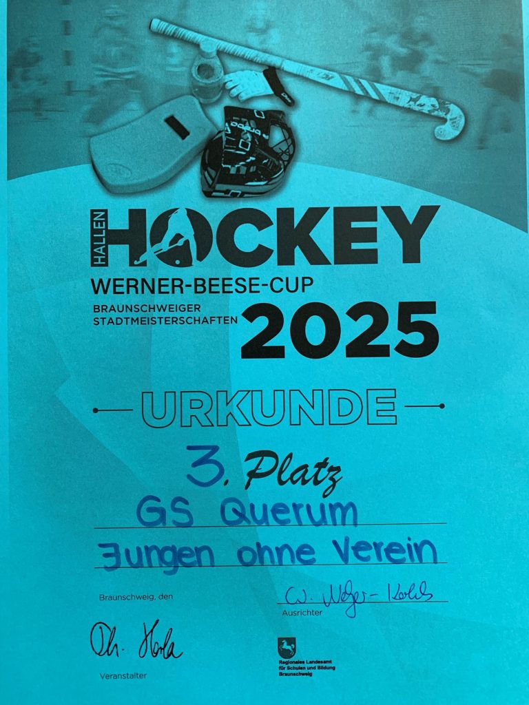 Am Mittwoch, den 12.03.2025 war es endlich soweit. Einige Kinder der Hockey-AG machten sich voller Vorfreude und Aufregung auf den Weg zum Werner-Beese-Cup, der Braunschweiger Stadtmeisterschaft der Grundschulen im Schulhockey. Insgesamt waren acht Schulmannschaften ohne Vereinserfahrung gemeldet, die in zwei Gruppen für jeweils 12 Minuten gegeneinander gespielt haben. Mit unermüdlichem Einsatz und toller Teamleistung hat die Grundschule Querum insgesamt fünf spannende Spiele bestritten und am Ende einen großartigen 3. Platz erkämpft. Herzlichen Glückwunsch an alle Kinder für diese tolle Leistung!