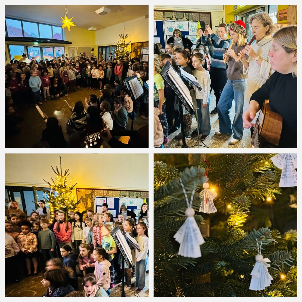 Weihnachten steht vor der Tür und somit findet wieder unser alljährliches Adventssingen statt. Jeden Donnerstagmorgen treffen wir uns um 8 Uhr in der Eingangshalle und singen gemeinsam weihnachtliche Lieder unter der Leitung von Frau Stolle und Frau Wegener. Auch Frau Struß und Frau Gremmels waren bereits musikalisch aktiv und spielten auf ihren Blockflöten mit. Außerdem durfte die 4d auf ihren selbstgebauten Streichholzgitarren „Morgen kommt der Weihnachtsmann“ vorspielen. Das habt ihr toll gemacht!